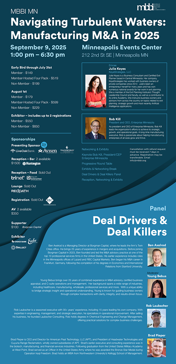 Spend your Tuesday afternoon in Minneapolis with MBBI for conversations that matter in manufacturing M&A. From an executive panel on Deal Drivers & Deal Killers to industry discussions and a closing reception, this is where business gets done.